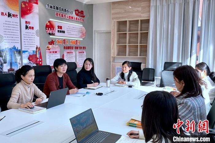 全國人大代表、寧夏銀川市二十一小學黨(dang) 總支書(shu) 記馬恒燕(左二)與(yu) 銀川市二十一小學健康城分校教師交流。 李佩珊 攝