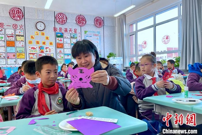 馬恒燕與(yu) 學生共上剪紙課。 李佩珊 攝