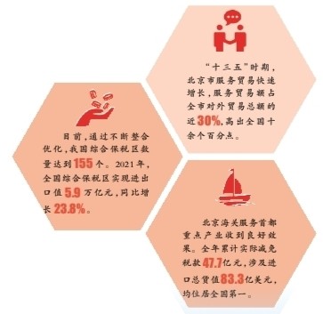 由加工貿易到醫藥物流集散、文化保稅展拍、航材保稅維修、保稅電商……北京天竺綜合保稅區經過多年發展,已成為(wei) 全國空港型綜合保稅區改革創新的積極踐行者,為(wei) 全國提供了一批可複製可推廣的“北京經驗”。“兩(liang) 區”建設啟動以來,34項政策全國先行先試,以首善標準打造高水平開放新高地,北京正在以創新的姿態,連接中外,擁抱未來,以海納百川的氣魄,引進國際優(you) 質要素資源。