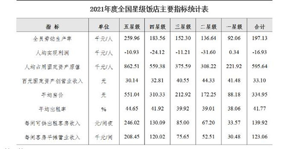 根據“2021年度全國星級飯店主要指標統計表 ”,平均房價(jia) 為(wei) 334.95元,每間可供出租客房收入為(wei) 139.92元/間夜,每間客房平攤營收為(wei) 123.06千元/間。