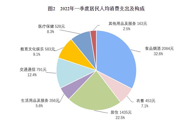 據悉,一季度,全國居民人均消費支出6393元,比上年名義(yi) 增長6.9%,扣除價(jia) 格因素影響,實際增長5.7%。分城鄉(xiang) 看,城鎮居民人均消費支出7924元,增長5.7%,扣除價(jia) 格因素,實際增長4.4%;農(nong) 村居民人均消費支出4388元,增長8.6%,扣除價(jia) 格因素,實際增長7.8%。一季度,全國居民人均食品煙酒消費支出2084元,增長4.9%,占人均消費支出的比重為(wei) 32.6%;人均衣著消費支出453元,增長3.6%,占人均消費支出的比重為(wei) 7.1%;人均居住消費支出1435元,增長6.7%,占人均消費支出的比重為(wei) 22.5%;人均生活用品及服務消費支出356元,增長4.8%,占人均消費支出的比重為(wei) 5.6%;人均交通通信消費支出791元,增長12.7%,占人均消費支出的比重為(wei) 12.4%;人均教育文化娛樂(le) 消費支出583元,增長6.9%,占人均消費支出的比重為(wei) 9.1%;人均醫療保健消費支出528元,增長9.1%,占人均消費支出的比重為(wei) 8.3%;人均其他用品及服務消費支出163元,增長17.1%,占人均消費支出的比重為(wei) 2.5%。