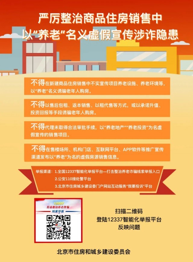 據“安居北京”公眾(zhong) 號消息,北京住建委發布提示,不得在新建商品住房銷售中不實宣傳(chuan) 項目養(yang) 老設施、養(yang) 老環境等,以“養(yang) 老”名義(yi) 誘騙老年人購房。不得以售後包租、返本銷售、以租代售等方式,或以承諾升值、投資回報等手段誘騙老年人購房。