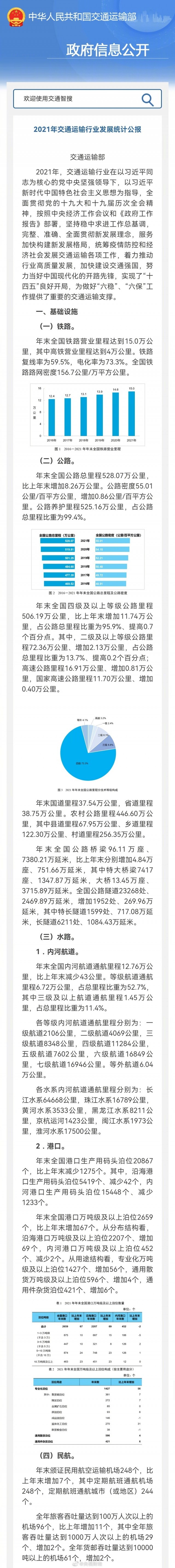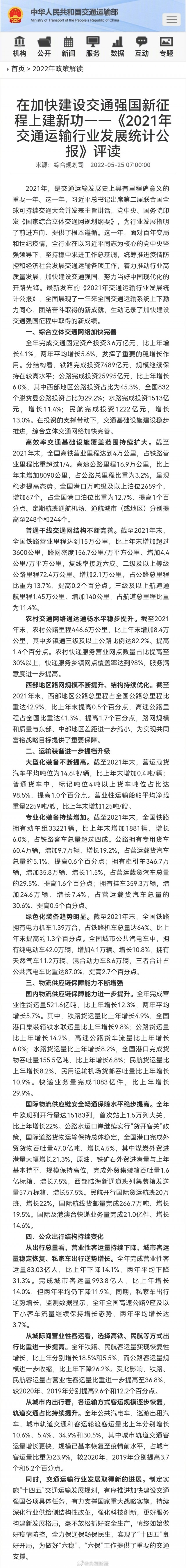 今天(25日),交通運輸部發布《2021年交通運輸行業(ye) 發展統計公報》。2021年我國完成交通固定資產(chan) 投資3.6萬(wan) 億(yi) 元,比2020年增長4.1%,分結構看,鐵路完成投資7489億(yi) 元,規模繼續保持在較高水平。截至2021年末,我國高鐵營業(ye) 裏程達到4萬(wan) 公裏,占鐵路營業(ye) 裏程比重超過1/4。此外,我國農(nong) 村交通網絡通達通暢水平穩步提升。去年,我國農(nong) 村公路裏程446.6萬(wan) 公裏,比2020年增加8.4萬(wan) 公裏。農(nong) 村快遞服務營業(ye) 網點數量占比提高至30%以上,快遞服務鄉(xiang) 鎮網點覆蓋率達到98%,服務滿意度進一步提高。