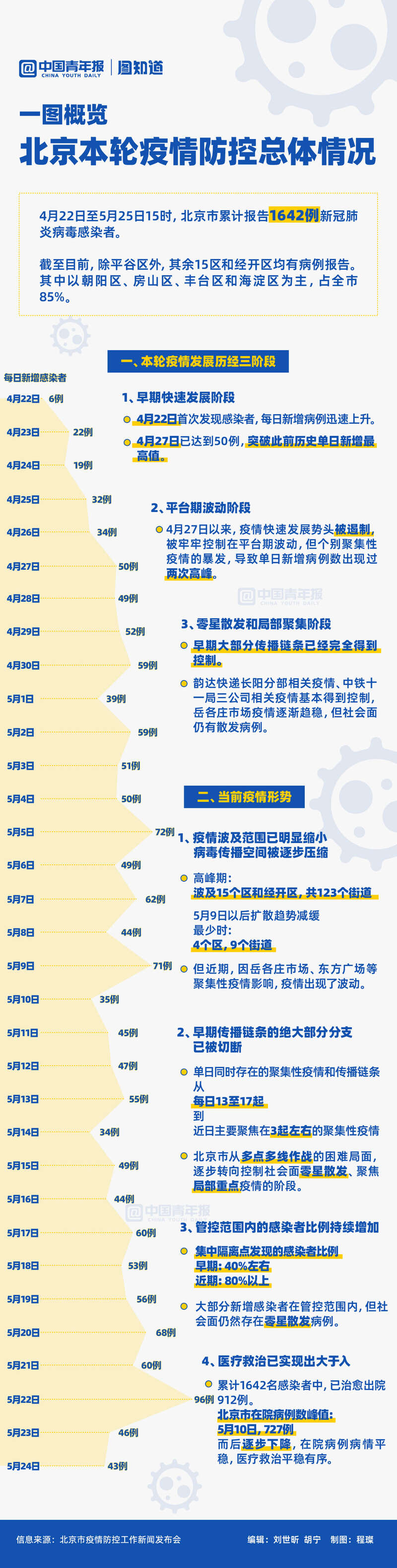 4月22日至5月25日15時,北京市累計報告1642例新冠肺炎病毒感染者,除平穀區外全市各區均出現了病例。超大城市迎戰奧密克戎,難之又難的以快製快之戰打得怎麽(me) 樣、當前北京疫情形勢如何?一圖回顧。