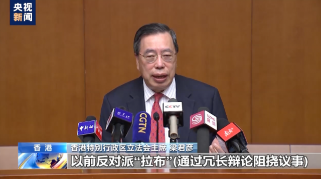 梁君彥說:“以前反對派‘拉布’(通過冗長辯論阻撓議事),把你拉到什麽(me) 都做不了。反對派就是用所有不同的方法拖‘一國兩(liang) 製’的後腿。”