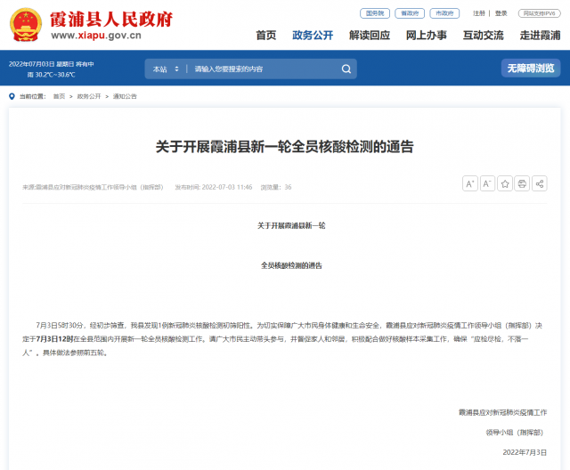 央視網消息:據霞浦縣人民政府網站消息,福建省寧德市霞浦縣應對新冠肺炎疫情工作領導小組(指揮部)7月3日發布通報, 7月3日5時30分,經初步篩查,霞浦縣發現1例新冠肺炎核酸檢測初篩陽性。為(wei) 切實保障廣大市民身體(ti) 健康和生命安全,霞浦縣應對新冠肺炎疫情工作領導小組(指揮部)決(jue) 定於(yu) 7月3日12時在全縣範圍內(nei) 開展新一輪全員核酸檢測工作。