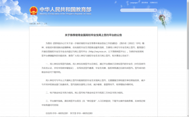 中國青年報客戶端北京7月6日電(中青報·中青網記者 葉雨婷)記者今天從(cong) 教育部獲悉,為(wei) 積極應對新冠肺炎疫情影響,優(you) 化高校畢業(ye) 生求職就業(ye) 服務流程,方便用人單位與(yu) 畢業(ye) 生網上簽約,教育部已開通全國高校畢業(ye) 生畢業(ye) 去向登記與(yu) 網上簽約平台(https://wq.ncss.cn,以下簡稱網簽平台)。網上簽約電子就業(ye) 協議書(shu) 與(yu) 紙質三方協議書(shu) 效力相同。