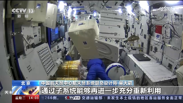 中國航天員中心航天員係統副總設計師 吳大蔚:它(二氧化碳還原係統)主要是能夠實現再生,把我們(men) 呼出的二氧化碳,通過子係統能夠再進一步充分重新利用,再用於(yu) 我們(men) 的空間站,所以能夠節約大量資源,減少我們(men) 上行的資源和代價(jia) 。