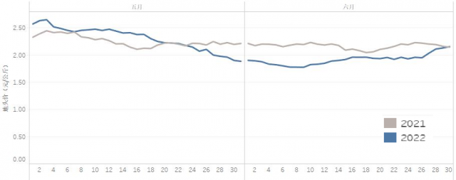 從(cong) 價(jia) 格走勢看(圖1),呈現三個(ge) 特點:一是整體(ti) 處於(yu) 低價(jia) 區間。6月是我國露地蔬菜生產(chan) 旺季,全國平均氣溫、平均降水量較常年同期偏高,平均日照時數較2021年偏多,整體(ti) 有利於(yu) 蔬菜生產(chan) ,供應較為(wei) 充足,月均地頭價(jia) 環比、同比均呈下降態勢。二是月內(nei) 上旬呈下降趨勢。6月9日蔬菜地頭價(jia) 1.78元/公斤,較月初1.90元/公斤下降了6.3%,跌至2022年以來的最低點,比年內(nei) 最高價(jia) (4.21元/公斤)下降57.7%。三是中下旬價(jia) 格止跌回升。經曆6月10—16日和26—30日兩(liang) 輪較大幅度上漲,月末價(jia) 格達到2.16元/公斤,比6月9日價(jia) 格上升了21.3%。上漲主要原因:一方麵,黃淮海及環渤海等地區因持續高溫天氣,設施蔬菜提前拉秧,供應量減少。另一方麵,南方持續降雨影響蔬菜正常生長和采收,江西、湖南、廣西、福建等省部分地區發生不同程度洪澇災害,100多萬(wan) 畝(mu) 蔬菜受災。此外,受疫情影響的社會(hui) 性消費開始複蘇,蔬菜需求量增加。