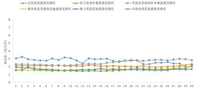 6月中後期地頭價(jia) 從(cong) 主產(chan) 區看(圖2),除雲(yun) 貴高原夏秋蔬菜優(you) 勢區月均地頭價(jia) 環比持平外,其他優(you) 勢區地頭價(jia) 均有所下降,其中北部產(chan) 區降幅相對較大。黃土高原夏秋蔬菜優(you) 勢區、黃淮海及環渤海設施蔬菜優(you) 勢區、北部夏秋蔬菜優(you) 勢區、長江流域冬春蔬菜優(you) 勢區、華南及西南熱區冬春蔬菜優(you) 勢區6月月均地頭價(jia) 環比分別下降了31.7%、19.3%、18.5%、17.8%、6.6%。
