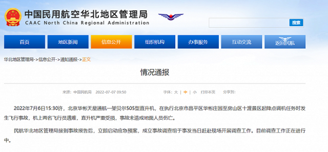 據民航局華北地區管理局網站7月7日消息,2022年7月6日15:30許,北京華彬天星通航一架貝爾505型直升機,在執行北京市昌平區華彬莊園至房山區十渡景區起降點調機任務時發生飛行事故,機上兩(liang) 名飛行員遇難,直升機嚴(yan) 重受損,事故未造成地麵人員傷(shang) 亡。
