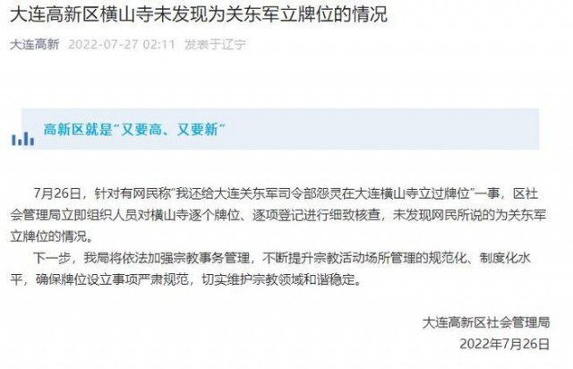 據大連高新微信公眾(zhong) 號消息, 7月26日,針對有網民稱“我還給大連關(guan) 東(dong) 軍(jun) 司令部怨靈在大連橫山寺立過牌位”一事,區社會(hui) 管理局立即組織人員對橫山寺逐個(ge) 牌位、逐項登記進行細致核查,未發現網民所說的為(wei) 關(guan) 東(dong) 軍(jun) 立牌位的情況。