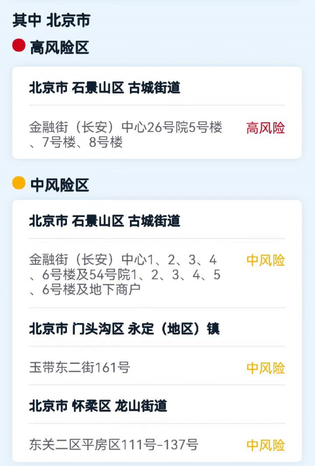 北京現有高、中風險區1+3個