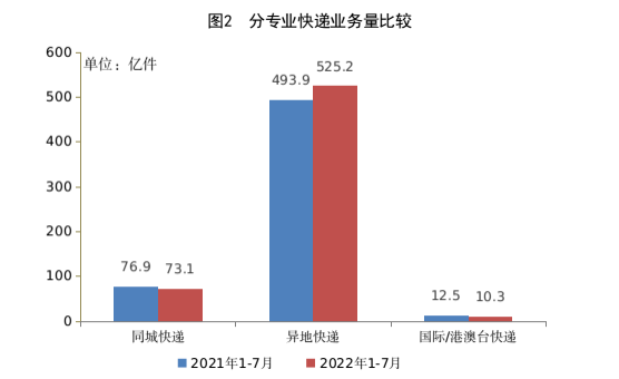 1-7月,全國快遞服務企業(ye) 業(ye) 務量累計完成608.6億(yi) 件,同比增長4.3%;業(ye) 務收入累計完成5880.4億(yi) 元,同比增長3.7%。其中,同城業(ye) 務量累計完成73.1億(yi) 件,同比下降4.9%;異地業(ye) 務量累計完成525.2億(yi) 件,同比增長6.3%;國際/港澳台業(ye) 務量累計完成10.3億(yi) 件,同比下降17.8%。