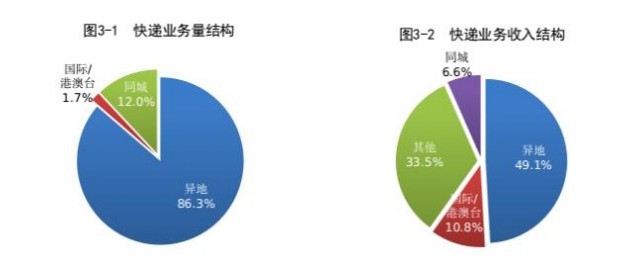 1-7月,同城、異地、國際/港澳台快遞業(ye) 務量分別占全部快遞業(ye) 務量的12.0%、86.3%和1.7%;業(ye) 務收入分別占全部快遞業(ye) 務收入的6.6%、49.1%和10.8%。與(yu) 去年同期相比,同城快遞業(ye) 務量的比重下降1.2個(ge) 百分點,異地快遞業(ye) 務量的比重上升1.6個(ge) 百分點,國際/港澳台業(ye) 務量的比重下降0.4個(ge) 百分點。
