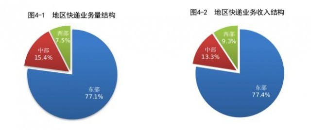 1-7月,東(dong) 、中、西部地區快遞業(ye) 務量比重分別為(wei) 77.1%、15.4%和7.5%,業(ye) 務收入比重分別為(wei) 77.4%、13.3%和9.3%。與(yu) 去年同期相比,東(dong) 部地區快遞業(ye) 務量比重下降1.5個(ge) 百分點,快遞業(ye) 務收入比重下降1.1個(ge) 百分點;中部地區快遞業(ye) 務量比重上升1.2個(ge) 百分點,快遞業(ye) 務收入比重上升0.6個(ge) 百分點;西部地區快遞業(ye) 務量比重上升0.3個(ge) 百分點,快遞業(ye) 務收入比重上升0.5個(ge) 百分點。