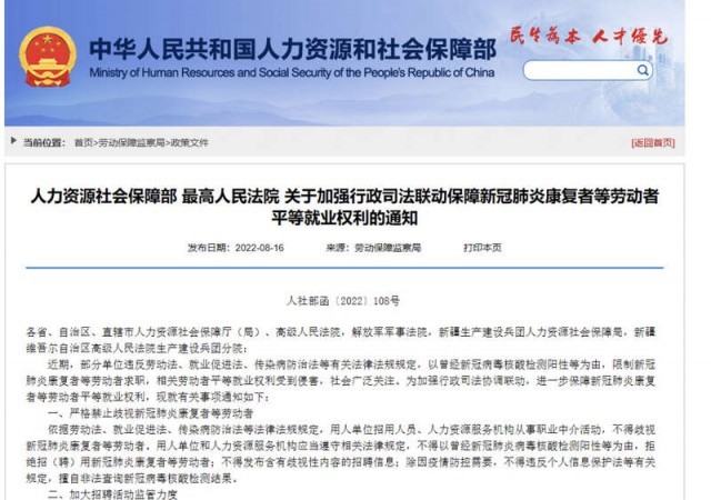 中國青年報客戶端北京8月16日電(中青報·中青網記者 李桂傑)人力資源和社會(hui) 保障部、最高人民法院今天發布《關(guan) 於(yu) 加強行政司法聯動保障新冠肺炎康複者等勞動者平等就業(ye) 權利的通知》(以下簡稱《通知》),再次重申嚴(yan) 格禁止歧視新冠肺炎康複者等勞動者,並就加強就業(ye) 歧視案件審理工作作出部署。