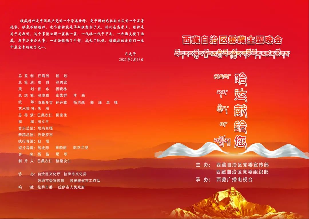 為(wei) 展現援藏工作成就,弘揚援藏精神,表達西藏各族幹部群眾(zhong) 對習(xi) 近平總書(shu) 記和黨(dang) 中央的親(qin) 切關(guan) 懷、全國人民無私支援特別是對援藏幹部人才的敬意和感恩之情,由自治區黨(dang) 委宣傳(chuan) 部、自治區黨(dang) 委組織部共同主辦的援藏主題晚會(hui) 《哈達獻給您》將於(yu) 8月18日晚,在西藏衛視(《西藏新聞聯播》後)、西藏藏語衛視(19:30左右)播出,自治區七地市廣播電視台將同步播出(地市《新聞聯播》後)。