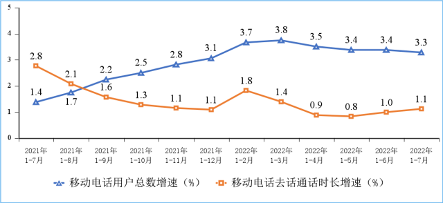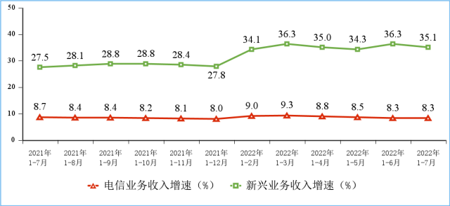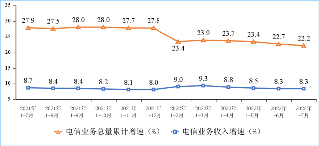 1—7月電信業務收入、總量同比分別增長8.3%和22.2%