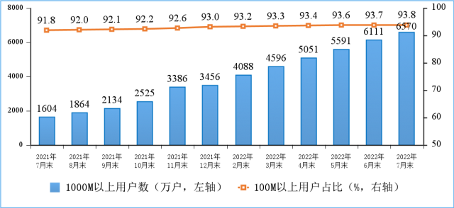 固定寬帶接入用戶規模穩步增長,千兆用戶數持續擴大。截至7月末,三家基礎電信企業(ye) 的固定互聯網寬帶接入用戶總數達5.66億(yi) 戶,比上年末淨增3070萬(wan) 戶。其中,100Mbps及以上接入速率的固定互聯網寬帶接入用戶達5.31億(yi) 戶,占總用戶數的93.8%,占比較上年末提升0.8個(ge) 百分點;1000Mbps及以上接入速率的固定互聯網寬帶接入用戶達6570萬(wan) 戶,比上年末淨增3112萬(wan) 戶,占總用戶數的11.6%。