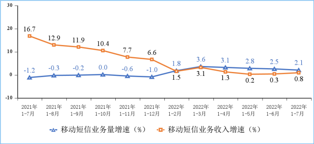 移動電話通話量小幅增長,移動短信業(ye) 務收入增速回升。1—7月份,移動電話去話通話時長完成1.32萬(wan) 億(yi) 分鍾,同比增長1.1%;固定電話主叫通話時長完成483.5億(yi) 分鍾,同比下降11.8%。1—7月份,全國移動短信業(ye) 務量同比增長2.1%,移動短信業(ye) 務收入同比增長0.8%,增速較上半年分別回落0.4個(ge) 和提升0.5個(ge) 百分點。