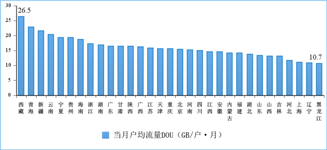 中部地區移動互聯網接入流量增速領先,西部部分省份DOU值居全國前列。1—7月份,東(dong) 、中、西部和東(dong) 北地區移動互聯網接入流量分別達到622.1億(yi) GB、330.6億(yi) GB、434.6億(yi) GB和75.5億(yi) GB,同比增長19.1%、20.5%、19.4%和12.5%。西藏、青海、新疆和雲(yun) 南4省7月當月戶均移動互聯網接入流量(DOU)超過20GB/戶·月;各省DOU值最高值與(yu) 最低值之差為(wei) 15.8GB/戶·月,差值較去年同期擴大2.4GB/戶·月。