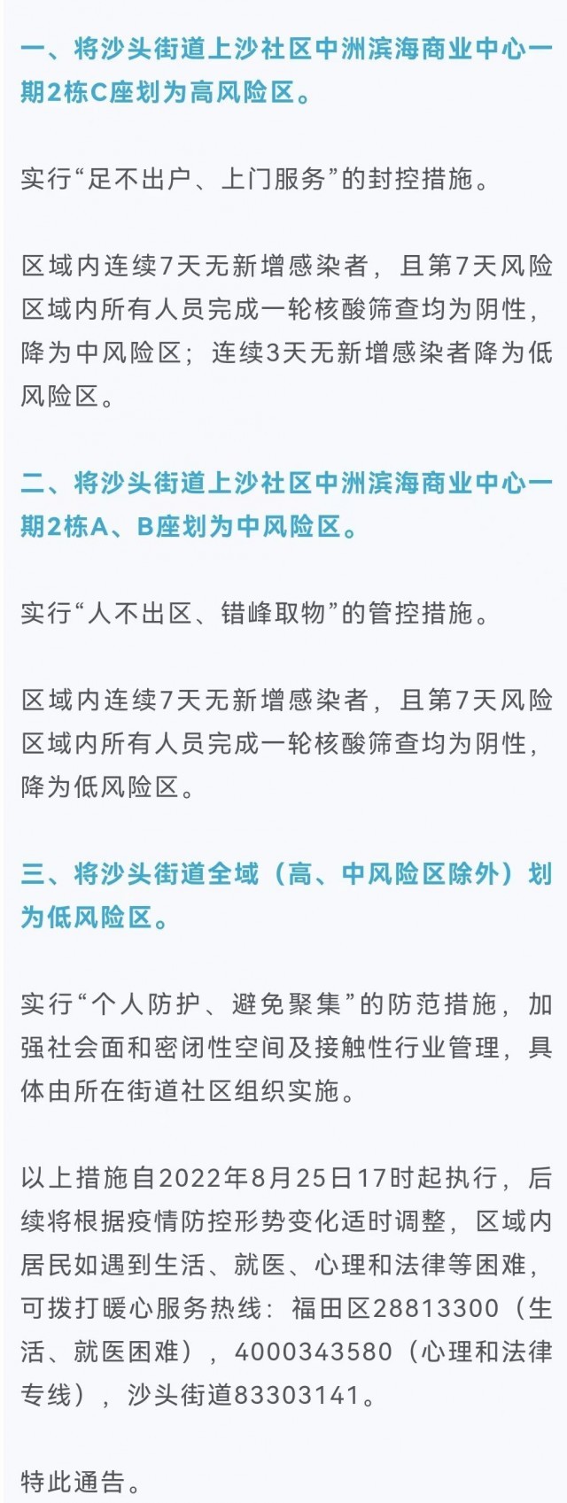 8月25日,廣東(dong) 省深圳市福田區新型冠狀病毒肺炎疫情防控指揮部發布通告稱,根據當前福田區疫情防控工作需要,按照國務院應對新型冠狀病毒肺炎疫情聯防聯控機製綜合組《新型冠狀病毒肺炎疫情防控方案(第九版)》和《廣東(dong) 省新冠肺炎本地疫情應急處置方案(第五版)》相關(guan) 規定,經專(zhuan) 家組研判,自2022年8月25日起,福田區在沙頭街道劃定高風險區、中風險區、低風險區如下: