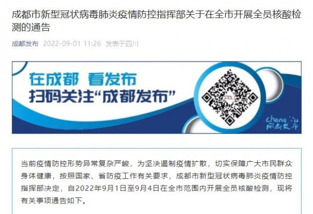 央視網消息:9月1日,成都市新型冠狀病毒肺炎疫情防控指揮部發布《關(guan) 於(yu) 在全市開展全員核酸檢測的通告》。
