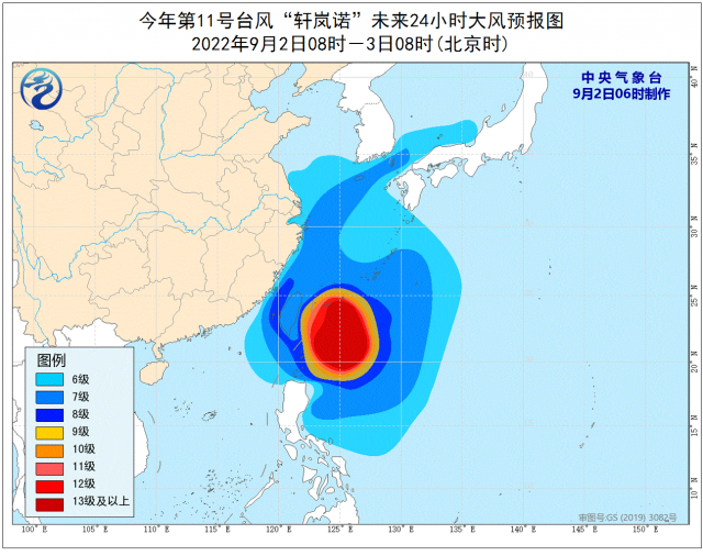 大風預報:9月2日08時至3日08時,巴士海峽、台灣海峽、台灣以東(dong) 洋麵、東(dong) 海大部及釣魚島附近海域、長江口區、杭州灣,以及台灣島北部和東(dong) 部沿海、福建中北部沿海、浙江沿海、上海沿海、江蘇南部沿海將有6-8級大風,陣風9-10級,其中台灣以東(dong) 洋麵的風力有9-12級,陣風11-15級,“軒嵐諾”中心經過的附近海麵的風力有13-15級,陣風可達16-17級。