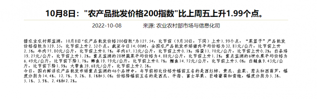 央視網消息:據農(nong) 業(ye) 農(nong) 村部網站,10月8日"農(nong) 產(chan) 品批發價(jia) 格200指數"為(wei) 127.54,比節前(9月30日,下同)上升1.99個(ge) 點,“菜籃子”產(chan) 品批發價(jia) 格指數為(wei) 129.35,比節前上升2.32個(ge) 點。截至今日14:00時,全國農(nong) 產(chan) 品批發市場豬肉平均價(jia) 格為(wei) 32.81元/公斤,比節前上升2.5%。
