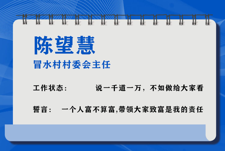 2011年,陳望慧加入了中國共產(chan) 黨(dang) 。這一年,冒水村換屆選舉(ju) ,陳望慧作為(wei) 村上的致富能人,在村黨(dang) 支部多次動員和群眾(zhong) 的勸說下,放下經營多年、收入可觀的飯店回村,當選為(wei) 冒水村村委會(hui) 主任。