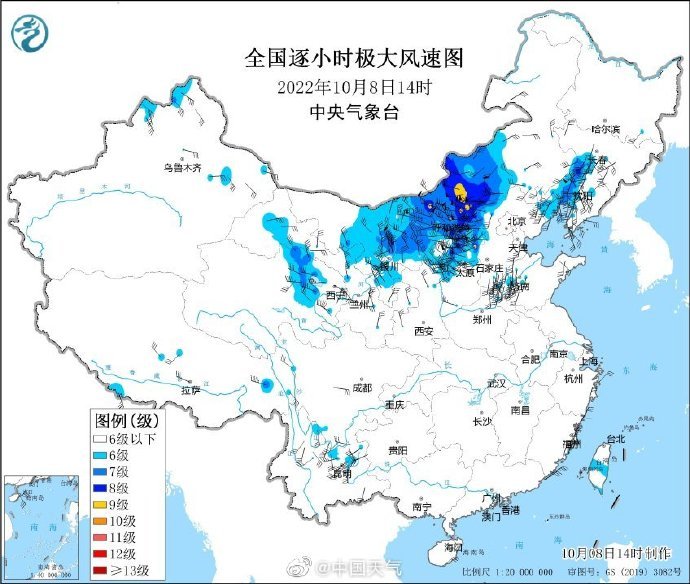 今天(10月8日)14時左右,內(nei) 蒙古中西部、寧夏等地已出現9級以上烈風。隨著冷空氣繼續推進,9日至10日,華北、東(dong) 北地區及黃淮、江淮等地也將先後出現5~6級偏北風,部分地區陣風7~9級,內(nei) 蒙古中部、華北北部局地可達10級,尤其京津冀及河南、山東(dong) 等局地大風有一定極端性。