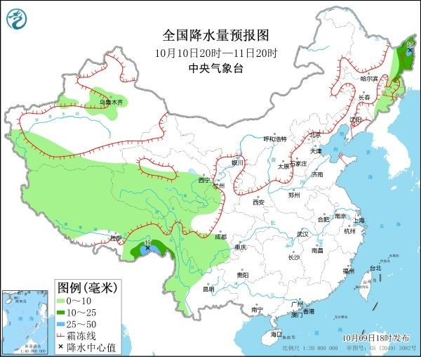 10月9日20時至10日20時,內(nei) 蒙東(dong) 南部、遼寧西部和北部、吉林東(dong) 南部等地有小到中雪或雨夾雪,局部有大雪或暴雪。內(nei) 蒙古東(dong) 南部、黑龍江東(dong) 部、吉林大部、遼寧西北部、西藏西南部和東(dong) 部、雲(yun) 南西部等地部分地區有中到大雨,其中,吉林東(dong) 部等地局地有暴雨(50~80毫米)。內(nei) 蒙古中東(dong) 部、黑龍江西南部、吉林西部、遼寧、河北北部、天津、山東(dong) 半島、江蘇東(dong) 部、浙江中北部等地部分地區有4~6級風,陣風7~8級(見圖2)。渤海、渤海海峽、黃海大部、東(dong) 海西部、台灣海峽、台灣以東(dong) 洋麵、巴士海峽、南海北部、北部灣將有8~9級、陣風10~11級的大風。