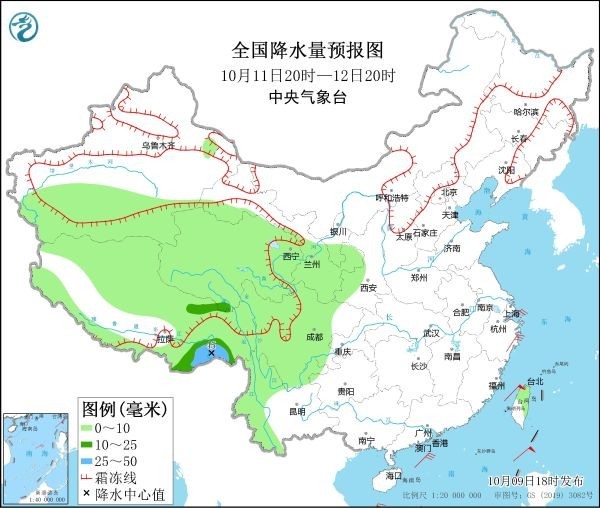 10月10日20時至11日20時,東(dong) 北地區東(dong) 部、新疆沿天山地區和南疆盆地、西藏、西北地區中部、四川西部和南部、雲(yun) 南西部等地部分地區有小到中雨,其中,黑龍江東(dong) 北部、西藏東(dong) 南部等地部分地區有大雨(25~45毫米)。吉林東(dong) 部、遼東(dong) 半島、山東(dong) 半島等地部分地區有5~6級風(見圖3)。渤海、渤海海峽、黃海大部、東(dong) 海大部、台灣海峽、台灣以東(dong) 洋麵、巴士海峽、南海北部和中部、北部灣將先後有7~9級、陣風10~11級的大風。