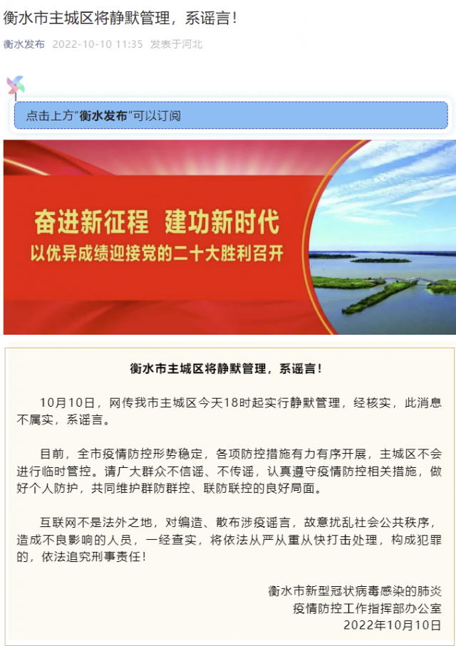 據“衡水發布”微信公眾(zhong) 號消息,衡水市新型冠狀病毒感染的肺炎疫情防控工作指揮部辦公室表示,10月10日,網傳(chuan) 衡水市主城區今天18時起實行靜默管理,經核實,此消息不屬實,係謠言。