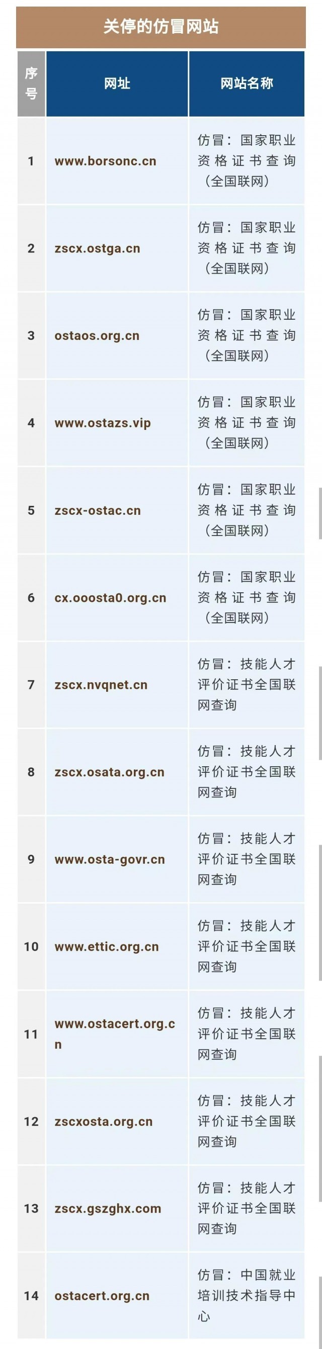根據網絡巡查和群眾(zhong) 舉(ju) 報情況,人力資源社會(hui) 保障部聯合有關(guan) 部門查實並關(guan) 停了14個(ge) 仿冒網站,其網站名稱、網址及頁麵內(nei) 容與(yu) 人力資源社會(hui) 保障部技能類“職業(ye) 資格證書(shu) ”“職業(ye) 技能等級證書(shu) ”(以下簡稱技能類評價(jia) 證書(shu) )查詢官方網站高度相似,容易誤導社會(hui) 公眾(zhong) 。目前,上述14個(ge) 網站均已被關(guan) 停。
