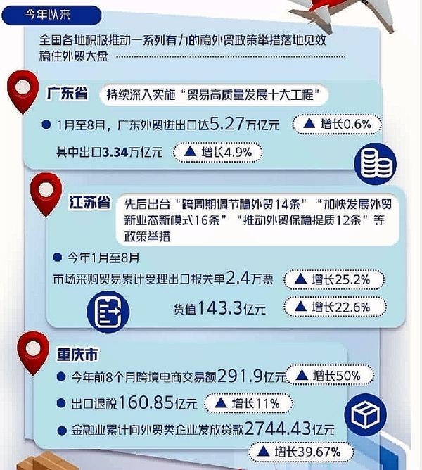 近日,商務部印發《支持外貿穩定發展若幹政策措施》,從(cong) 增強外貿履約能力、進一步開拓國際市場、強化保障能力、促進貿易暢通等方麵進行部署,加力穩外貿。實際上,今年以來,各地各部門出台了不少舉(ju) 措,幫助外貿企業(ye) 保訂單拓市場。各地舉(ju) 措有何創新之處,政策落實怎樣,效果如何?經濟日報-中國經濟網記者進行了采訪。