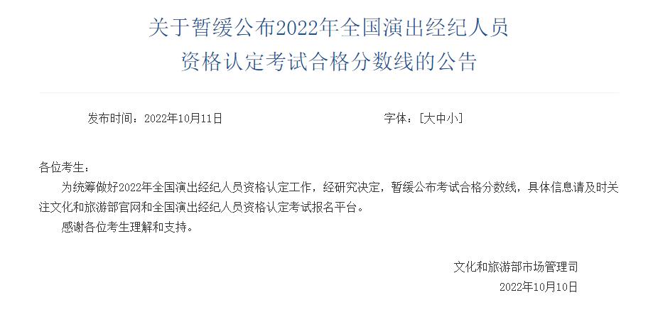 公告稱:“為(wei) 統籌做好2022年全國演出經紀人員資格認定工作,經研究決(jue) 定,暫緩公布考試合格分數線,具體(ti) 信息請及時關(guan) 注文化和旅遊部官網和全國演出經紀人員資格認定考試報名平台。感謝各位考生理解和支持。”(完)