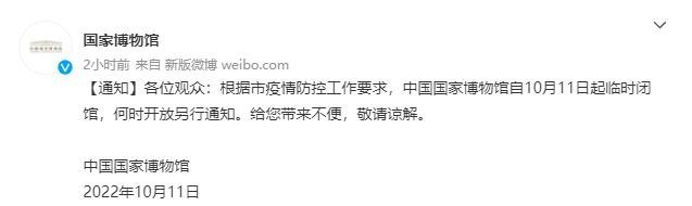 國家博物館10月10日發布通知稱,根據市疫情防控工作要求,中國國家博物館自10月11日起臨(lin) 時閉館,何時開放另行通知。給您帶來不便,敬請諒解。