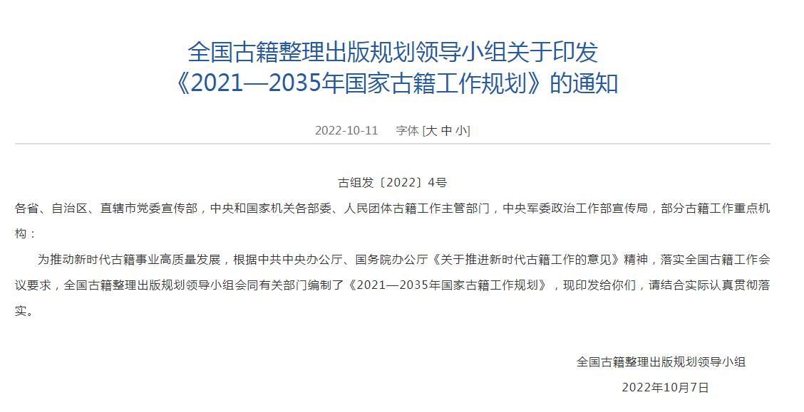 根據規劃,到2035年,古籍工作體(ti) 製機製更加完善,標準規範體(ti) 係基本健全,古籍保護、 整理研究和編輯出版成果豐(feng) 碩,質量明顯提升,古籍數字化資源建設取得重要進展, 古籍普及深入推進,人才隊伍發展壯大,古籍工作在傳(chuan) 承和弘揚中華優(you) 秀傳(chuan) 統文化中的作用更加突出。