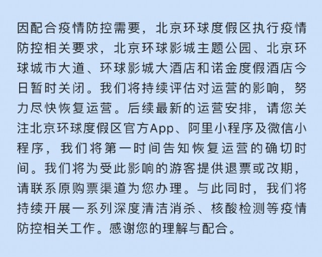 據@北京環球度假區 微博消息,因配合疫情防控需要,北京環球度假區執行疫情防控相關(guan) 要求,北京環球影城主題公園、北京環球城市大道、環球影城大酒店和諾金度假酒店今日暫時關(guan) 閉。我們(men) 將持續評估對運營的影響,努力盡快恢複運營。後續最新的運營安排,請您關(guan) 注北京環球度假區官方App、阿裏小程序及微信小程序,我們(men) 將第一時間告知恢複運營的確切時間。我們(men) 將為(wei) 受此影響的遊客提供退票或改期,請聯係原購票渠道為(wei) 您辦理。與(yu) 此同時,我們(men) 將持續開展一係列深度清潔消殺、核酸檢測等疫情防控相關(guan) 工作。感謝您的理解與(yu) 配合。