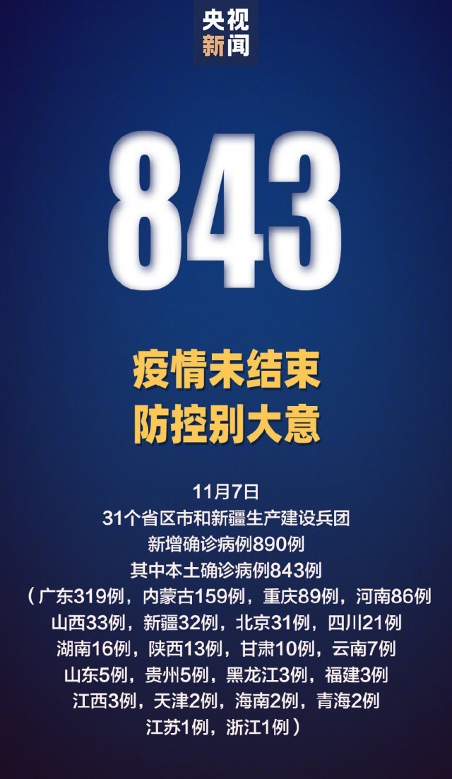 11月7日0—24時,31個(ge) 省(自治區、直轄市)和新疆生產(chan) 建設兵團報告新增確診病例890例。其中境外輸入病例47例(福建12例,廣東(dong) 12例,四川8例,北京5例,天津3例,上海3例,遼寧2例,江蘇1例,山東(dong) 1例),含2例由無症狀感染者轉為(wei) 確診病例(廣東(dong) 1例,四川1例);本土病例843例(廣東(dong) 319例,內(nei) 蒙古159例,重慶89例,河南86例,山西33例,新疆32例,北京31例,四川21例,湖南16例,陝西13例,甘肅10例,雲(yun) 南7例,山東(dong) 5例,貴州5例,黑龍江3例,福建3例,江西3例,天津2例,海南2例,青海2例,江蘇1例,浙江1例),含152例由無症狀感染者轉為(wei) 確診病例(廣東(dong) 121例,甘肅9例,四川7例,北京3例,重慶3例,福建2例,湖南2例,陝西2例,山西1例,黑龍江1例,浙江1例)。無新增死亡病例。無新增疑似病例。