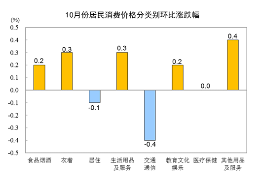 10月份,全國居民消費價(jia) 格環比上漲0.1%。其中,城市持平,農(nong) 村上漲0.1%;食品價(jia) 格上漲0.1%,非食品價(jia) 格持平;消費品價(jia) 格上漲0.1%,服務價(jia) 格持平。