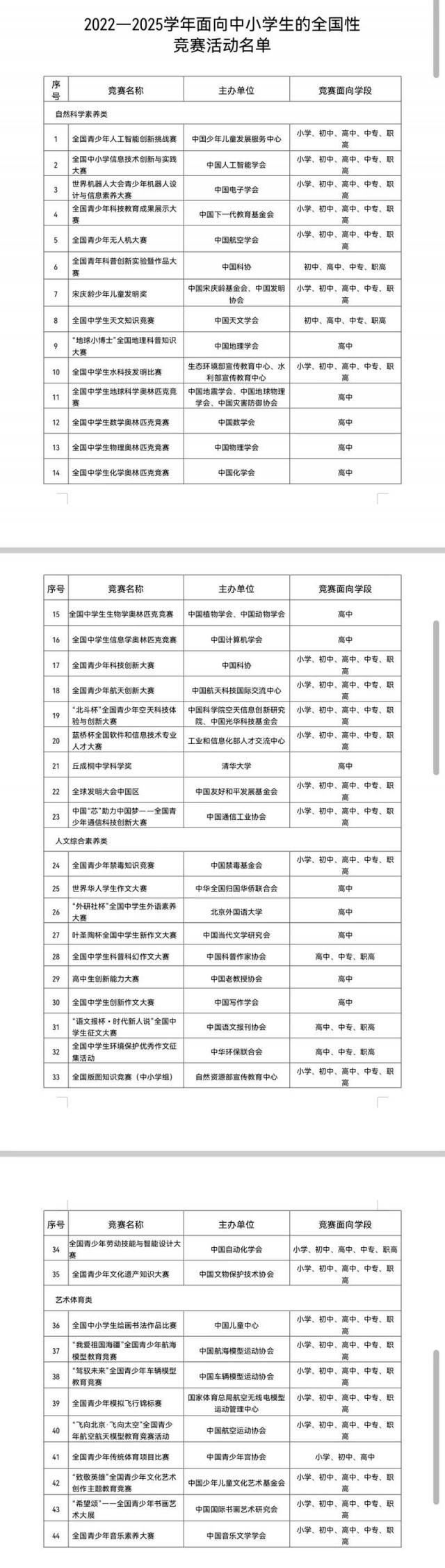 除上述違規競賽外,所謂的數學花園探秘、華數之星、五羊杯、走美杯、美國大聯盟、卓越360統測、全英賽、世奧賽等均未列入教育部公布的“麵向中小學生的全國性競賽活動名單”,均屬違規競賽。
