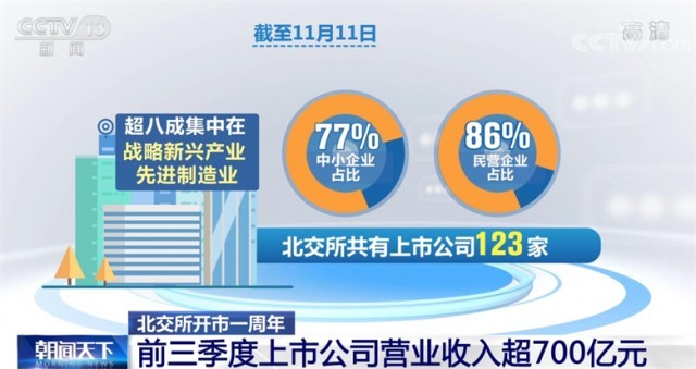 截至11月11日,北交所共有上市公司123家,其中,中小企業(ye) 占比77%,民營企業(ye) 占比86%,超八成集中在戰略新興(xing) 產(chan) 業(ye) 、先進製造業(ye) ;49家為(wei) 國家級“專(zhuan) 精特新”小巨人企業(ye) ,平均研發強度達5.4%,高於(yu) 社會(hui) 平均水平,創新特征鮮明。