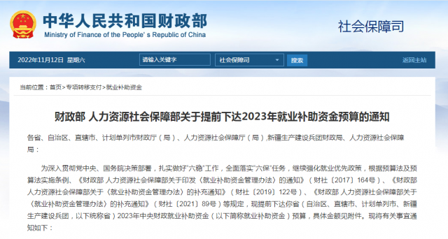 財政部、人社部10日發布《關(guan) 於(yu) 提前下達2023年就業(ye) 補助資金預算的通知》,提前下達資金達432.3億(yi) 元。