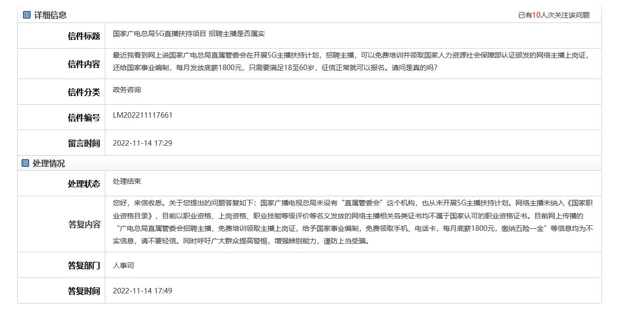 “廣電總局推5G主播扶持計劃還給事業編”?官方辟謠