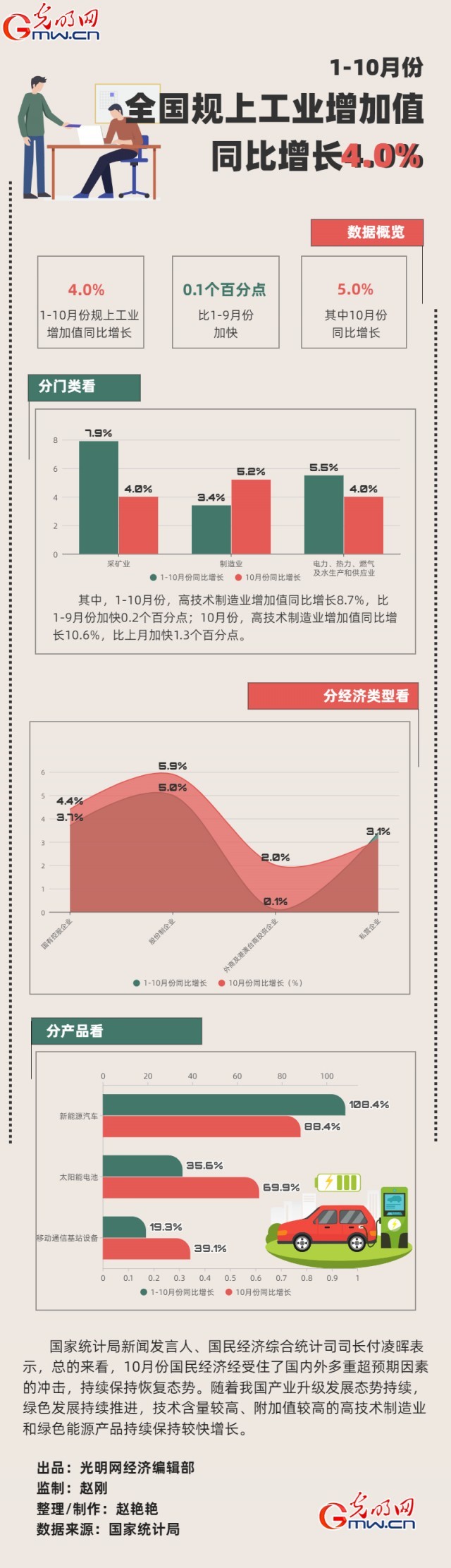 數據顯示,1-10月份,全國規模以上工業(ye) 增加值同比增長4.0%,比1-9月份加快0.1個(ge) 百分點。分三大門類看,采礦業(ye) 增加值同比增長7.9%,製造業(ye) 增長3.4%,電力、熱力、燃氣及水生產(chan) 和供應業(ye) 增長5.5%。高技術製造業(ye) 增加值同比增長8.7%,比1-9月份加快0.2個(ge) 百分點。分經濟類型看,國有控股企業(ye) 增加值同比增長3.7%;股份製企業(ye) 增長5.0%,外商及港澳台商投資企業(ye) 增長0.1%;私營企業(ye) 增長3.4%。分產(chan) 品看,新能源汽車、太陽能電池、移動通信基站設備等綠色智能產(chan) 品產(chan) 量同比分別增長108.4%、35.6%、19.3%。