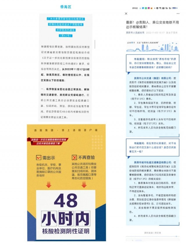 最早宣布取消的是貴陽市。11月3日,“貴陽市人民政府網”發布《最新!@貴陽人,乘公交坐地鐵不用出示核酸結果!》,宣布根據貴陽市《常態化核酸檢測實施方案》以及疫情防控的相關(guan) 要求,乘客乘坐公交車和地鐵時均不需要查驗核酸檢測結果。