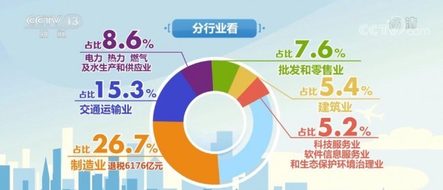 數據顯示,分行業(ye) 看,製造業(ye) 是受益最明顯的行業(ye) ,退稅6176億(yi) 元,占比26.7%;交通運輸業(ye) 占15.3%;電力、熱力、燃氣及水生產(chan) 和供應業(ye) 、批發和零售業(ye) 、建築業(ye) 、科技服務業(ye) 、軟件信息服務業(ye) 和生態保護環境治理業(ye) 占比從(cong) 8.6%到5.2%不等。